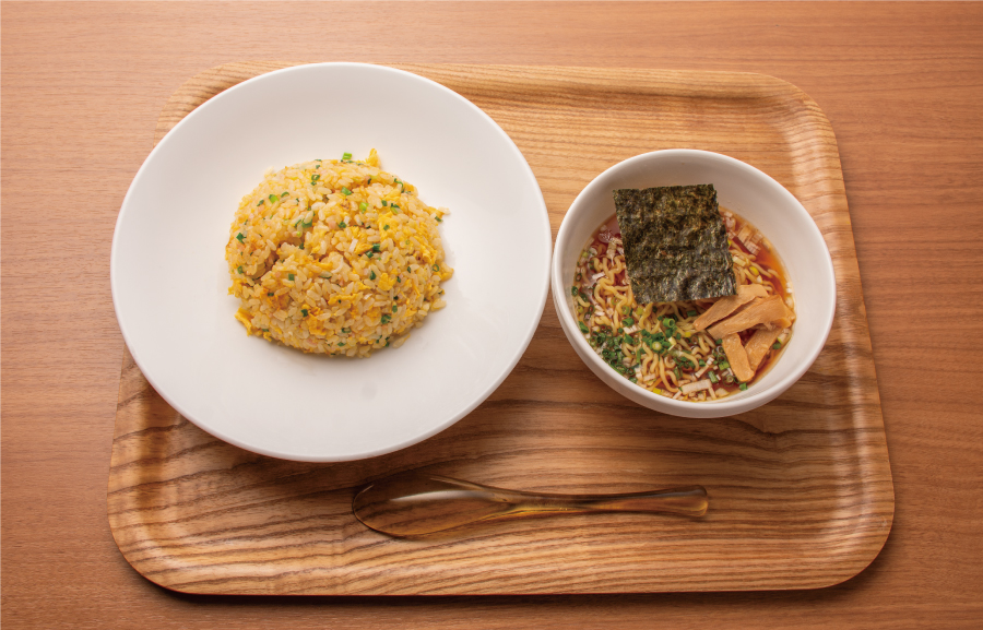 チャーハン・半ラーメン(醤油)・(土日のみ本日のデザート付き) ※半ラーメンは、塩味、プラス100円で担々麺に変更できます。※大盛りはチャーハン(プラス300円)のみ承ります。