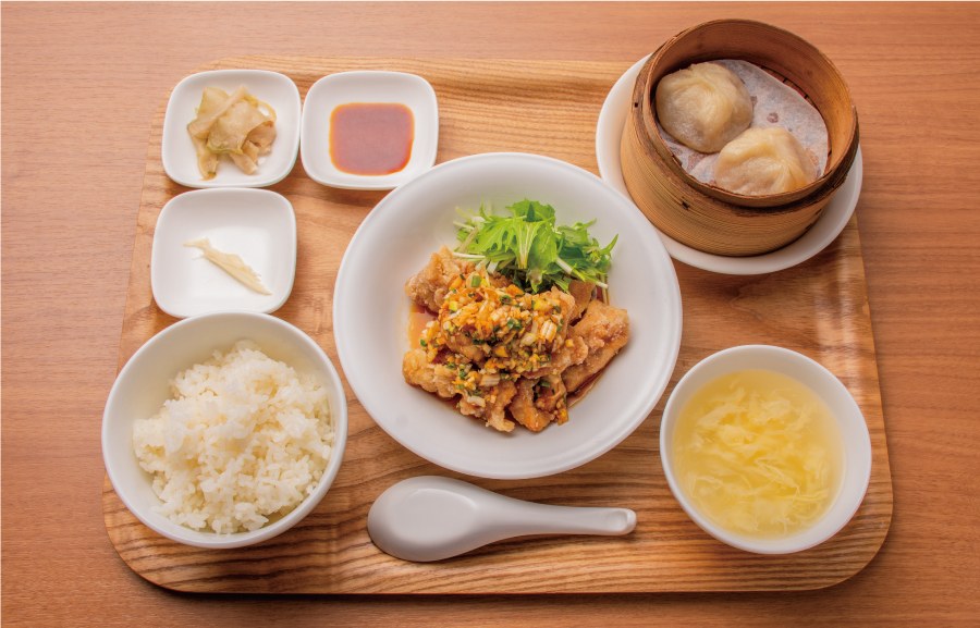 油淋鶏・アグー豚の小籠包・ライス・スープ・ザーサイ・(土日のみ本日のデザート付き) ※マイナス100円で小籠包を焼売に変更することもできます。 ※ご飯とスープは1回のみおかわりできます。